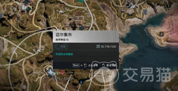 如图所示,可以看到这个传送点目前还没有解锁,坐标大约是(5911,-6585),先确定好这个点位,然后传送到最近的传送点,徒步跑过来或者是驾驶载具过来。