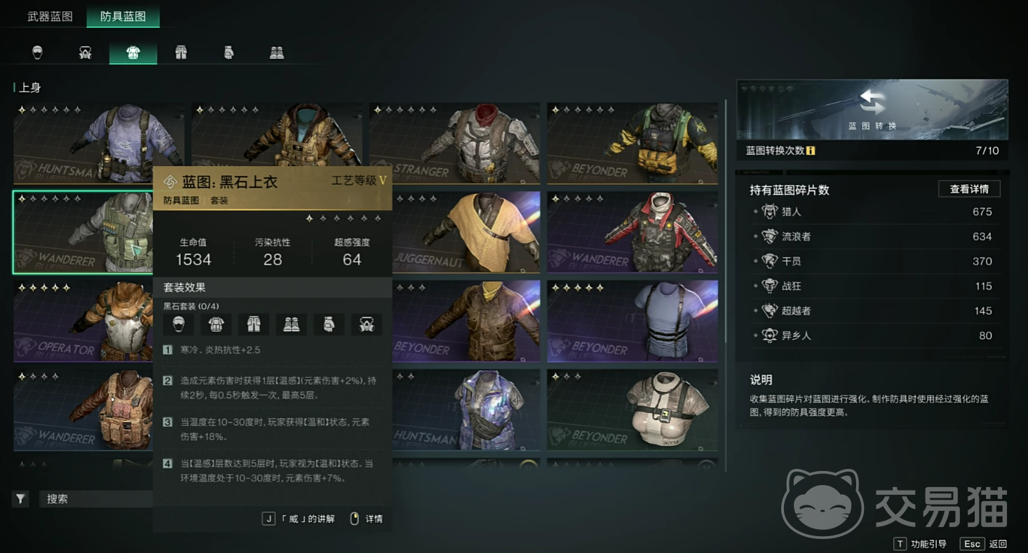 帽子和上衣可以选用黑石套装,黑石套装可以增加玩家至少1534点的防御数值,对污染的抗性有28点,最重要的是它能够增加感染强度,该感染强度的数值为64点,配合异常专家套件,能够给外层空间至少提升60%的异常属性值攻击增幅。