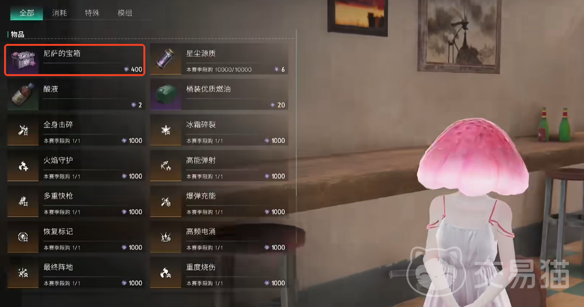 对尼萨对话可以开启商店,这里有400芽孢一个尼萨宝箱,还有1000芽孢的指定模组,也可以购买单价6芽孢的星尘源质,还有2芽孢单价的酸液,20芽孢的桶装优质燃油,当然这个开出的燃油数量是多是少随机,如果开出400大油还是很划算的。