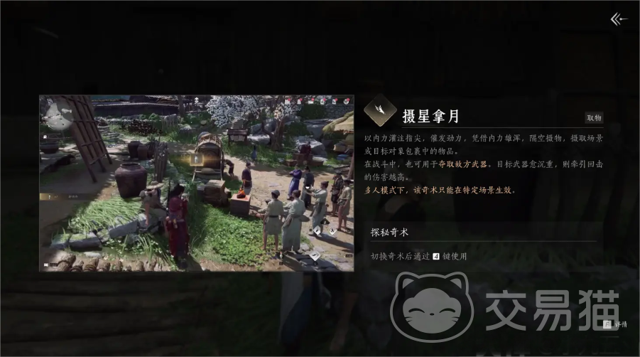 在触发该任务后,玩家需找到“仇越海”这一NPC,看似相貌平平其实身怀绝技,在与其对话后玩家将对奇术“摄星拿月”有所了解,通过此技能,玩家可以利用内力进行隔空取物,同时将其运用到战斗中,更能做到出其不意,在战斗中夺取敌人的武器。