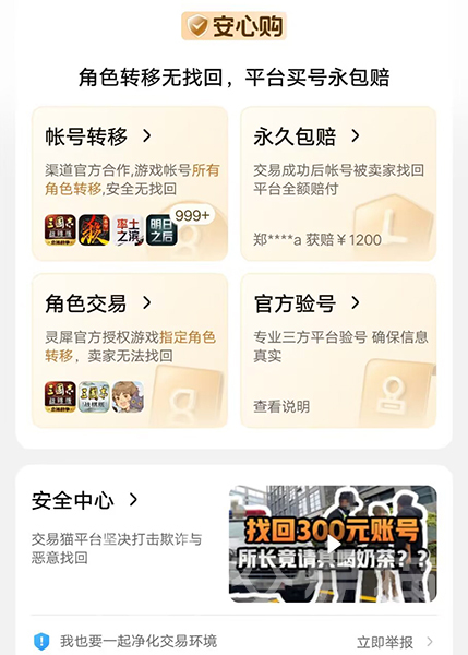 第三,帐号交易保障多。为了维护良好的交易氛围,交易猫上线多种保障,从基础版的担保抵押交易,到高级版的赠送永久包赔、极速帐号转移等,保证帐号售后无忧。玩家们购买高价帐号