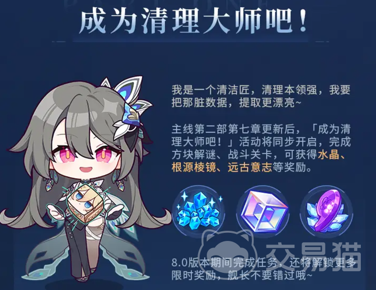 还会开放新的主线“怀抱旧愿的花束”,这是第二部第七章,推主线可以得到水晶、棱镜等奖励。主线更新之后还会同步开启“成为清理大师吧!”活动,参加活动完成解谜战斗,能得到水晶棱镜意志等奖励。