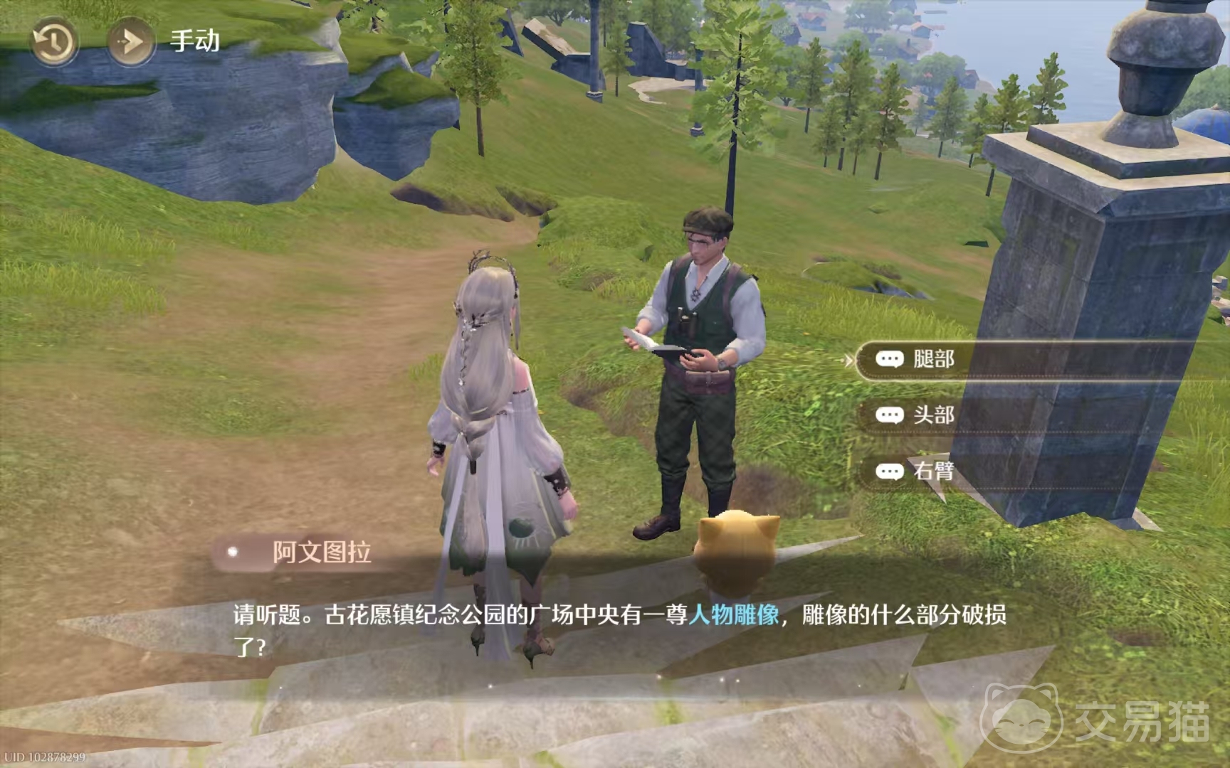进入答题界面之后,阿文图拉会问我们“古花愿镇广场中央的任务雕像是哪个部位受损了”,NPC给了我们“头部”,“腿部”和“右臂”三个选项。注意这个时候一定要选择“头部”作为答案哦!因为“腿部”和“右臂”均为错误答案,答错了是无法获得奖励的!