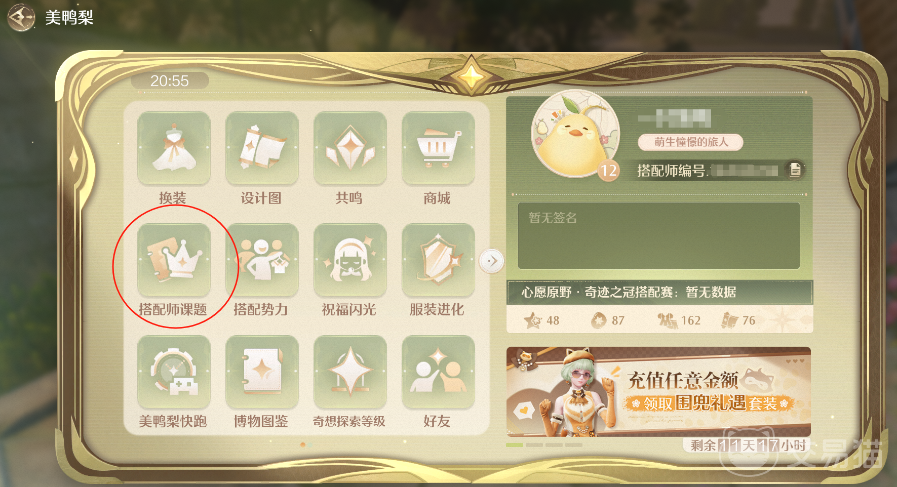 最近很多小伙伴都不知道无限暖暖搭配师活动入口在哪,一直找不到,下面简单给大家分享一下怎样去找到它,已经相关的活动内容是什么。搭配师就是小伙伴们自己,相关的搭配活动也是会长期存在的,小伙伴们需要通过自己的美鸭梨去寻找,点开左上角自己的美牙里之后点击搭配师课题,就可以参与相应的搭配师活动了。
