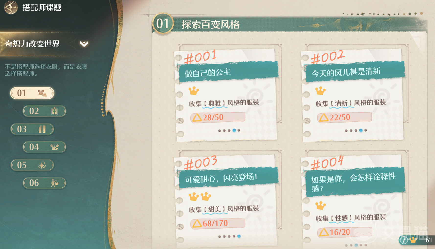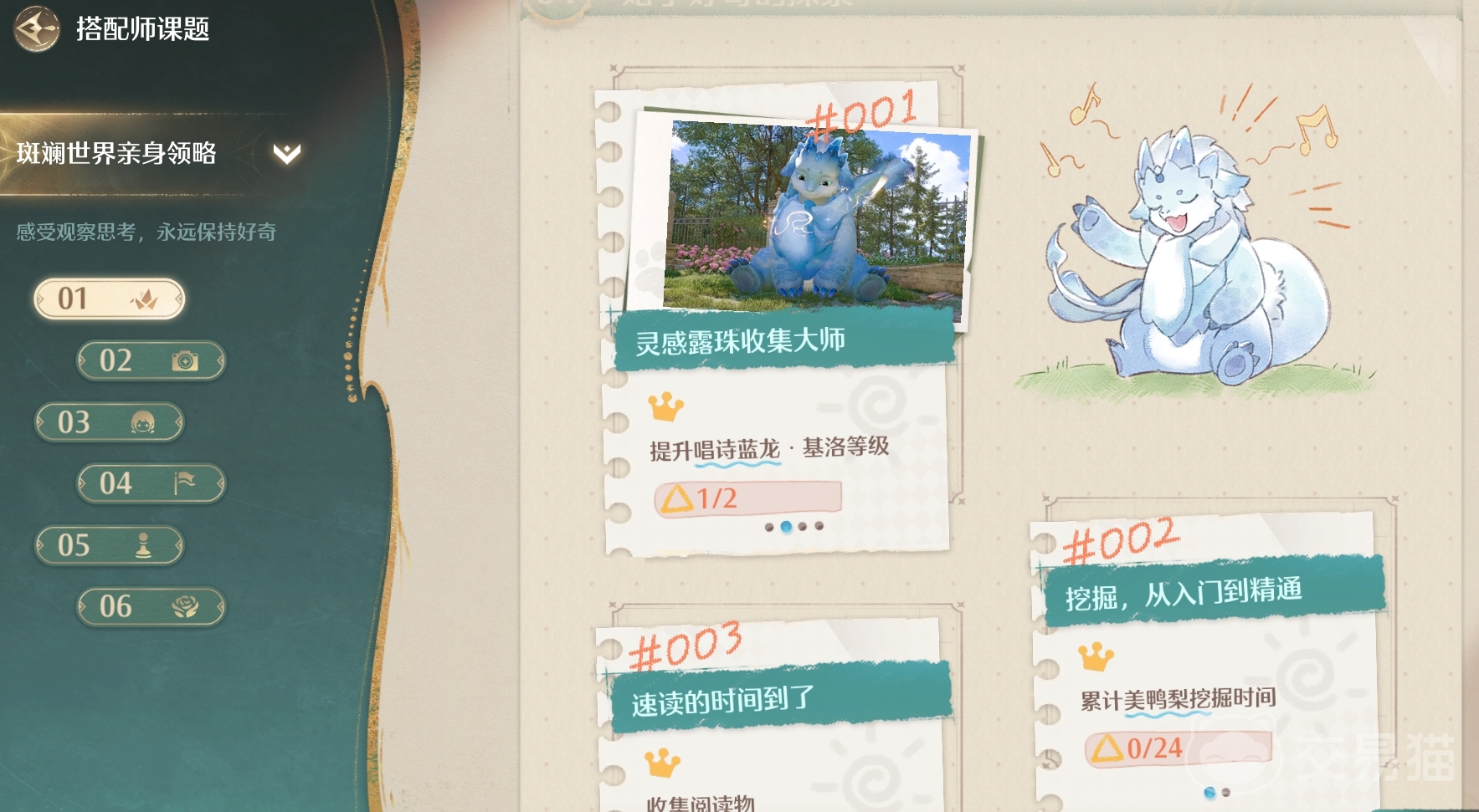 剩下的斑斓世界则是需要大家去收集各种灵感露珠以及阅读,还有相应的挖掘和拜访,都是能够丰富大家的课题内容的,提升搭配师课题,大家后续能够得到的评分就更高。
