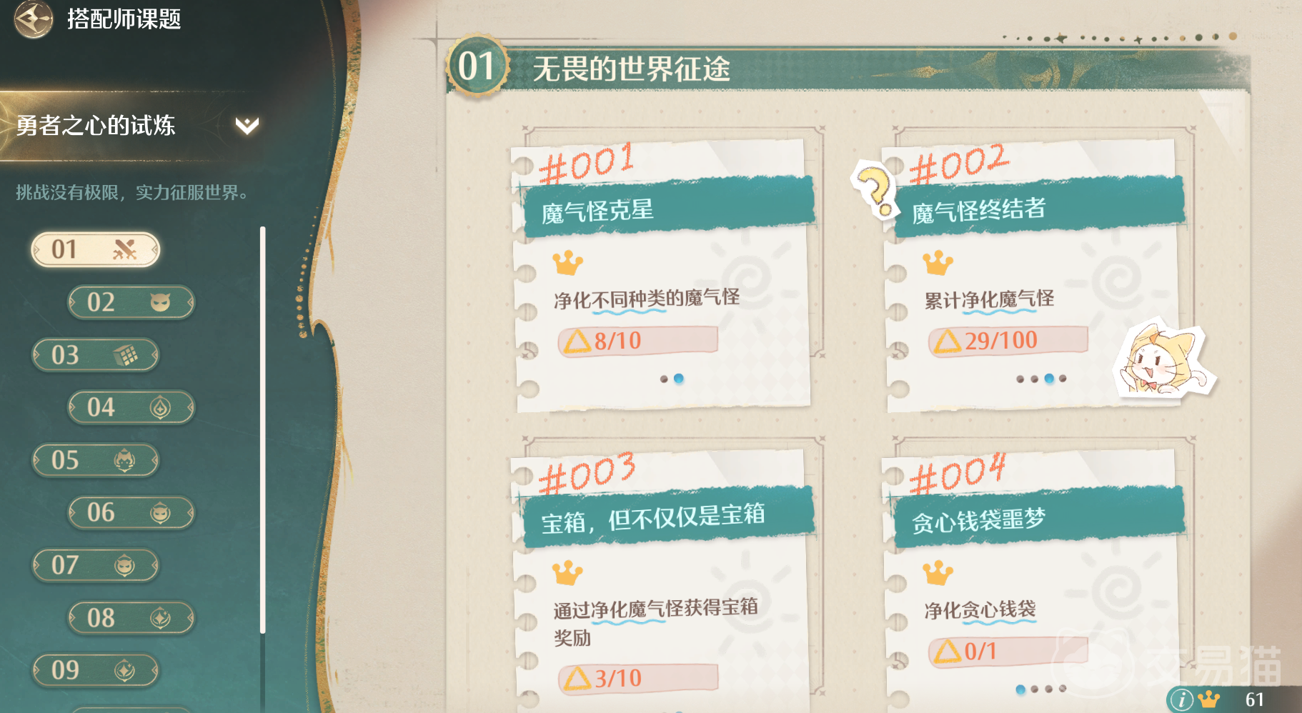 此外还有交流成长需要完成,这个小伙伴们通过完成各种特殊任务就可以,比如见闻任务和风物任务。至于勇者之心试炼则是需要大家去找各种宝箱以及净化各种魔气怪。