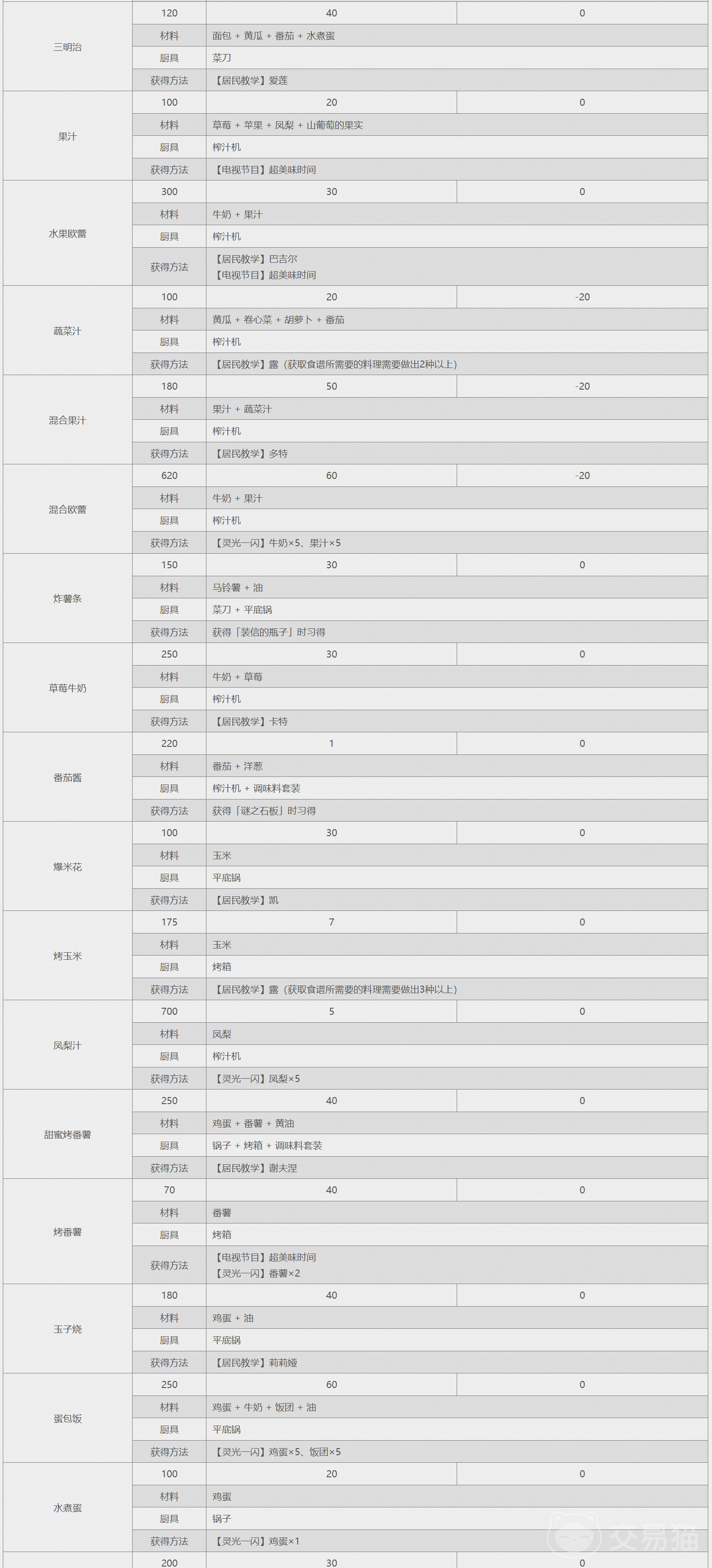 在小镇内居住着很多村民,它们每一个都身怀绝技,有自己的独家秘方,当你与部分村民好感度达到4星以上之后,再赠送给他们“普通”品质及以上的物品,接着对方就会教给你一个新食谱,如哈里斯会教炒饭的做法,哥兹会教御好烧的做法等。此外,当你触发了安娜的点心教室事件后,你就能习得6种甜品配方,想要触发这一事件,需要你与安娜的友好度达到8点,且和安娜一家都说过话。