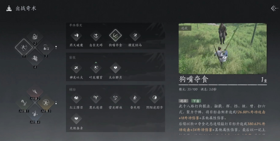 另外一个奇术狗嘴夺食使用时,会消耗35点精元。燕云十六声这款游戏的奇术有一个特点,消耗精元越大,伤害就越大。狗嘴夺食专攻击敌人的下盘,技能释放后可以造成1000%+的外功伤害,是新手前期必备的两个奇术之一。奇术除了单独使用以外,还可以组合起来搭配使用。比如金蝉和狮吼,这两个技能适合在敌人众多时使用,奇术释放后,可以快速扭转战场局势。