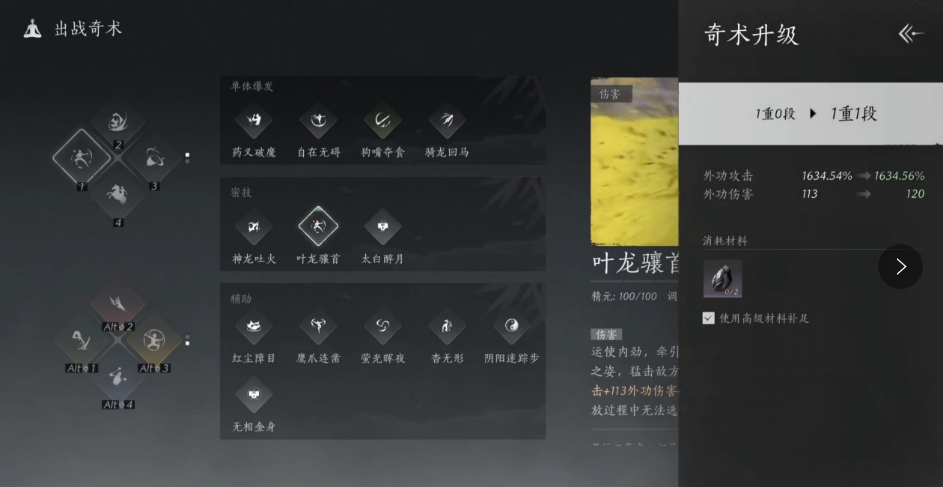 获得一定数量的乌金铁以后,就可以点击相应的奇术进行升级啦!接下来给大家推荐两个需要优先升级的奇术,分别是骑龙回马、狗嘴夺食。使用骑龙回马这个奇术时,会消耗15点精元,而这15点精元就会转化为600%+伤害,可以快速将对手击伤,是一个很不错的连续性进攻技能。