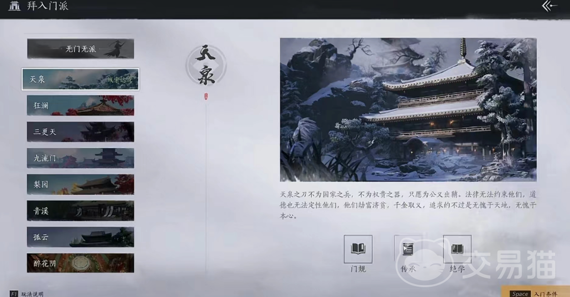 目前可供玩家们选择的门派一共有11个,如果小伙伴们比较喜欢近战的职业,那么天泉就是一个相当不错的选择。想加入天泉,需要先打败两个为非作歹的小怪,然后再找到npc张一豪申请加入。天泉使用刀作为武器,在战斗中不仅可以贴身对敌人造成高额伤害,同时还能为自己添加一个护盾,属于是能扛能打的角色,即使是在群战里表现也相当不错。