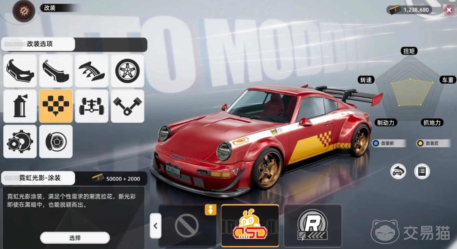 玩家在改装的时候针对外观改装跟性能改装,所谓的外观改装就是将车辆的配色进行更改,在更改的时候所选择的色号具备多样性,而玩家可以个性化的更改。除了外观颜色更改以外,对于前后护栏等等,其他外观部件也是可以更改的,当然整个汽车的性能也是可以提升的。