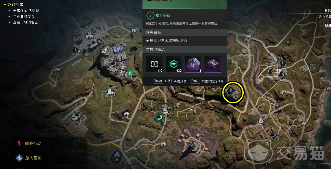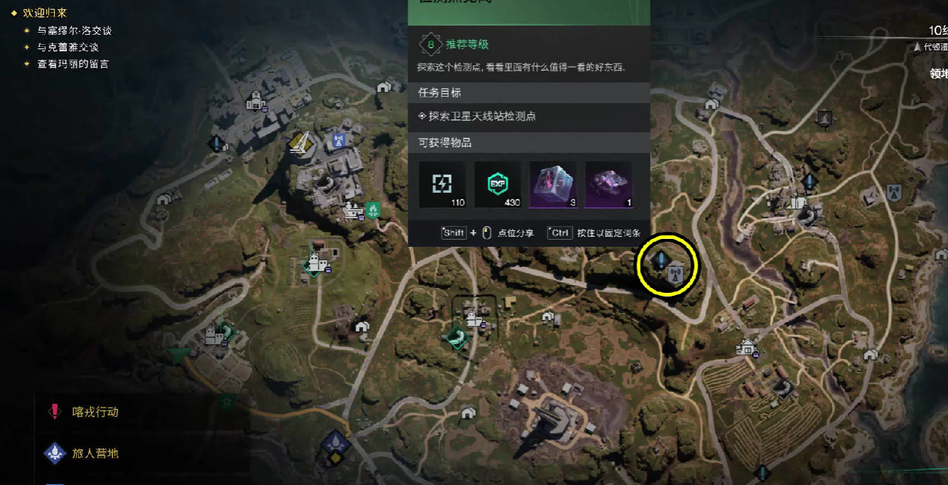 随后玩家直接打开大地图,就能够找到一个绿色的感叹号,任务的目标是要求玩家探索卫星天成站检测点,完成这个任务时,玩家不仅可以获得少量的电量资源,也可以获得紫色属性的净化物。