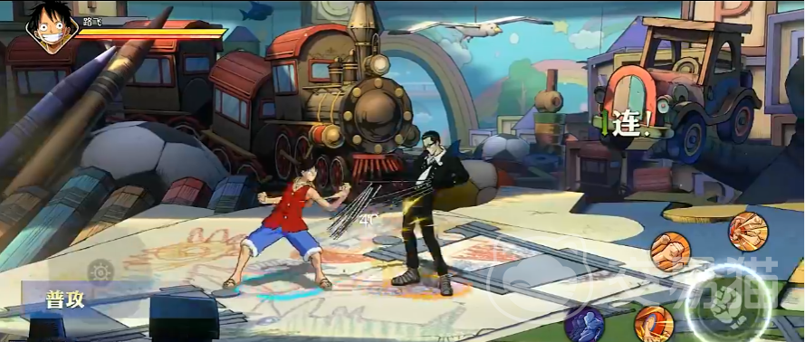 技能一展开橡皮之果的能力效果,使用拳头快速打击前面的敌方,技能结束时点普攻,能对敌方追加一次攻击。并且前面的招式在使用过程中可以向前操控摇杆,让路飞能移动向前攻击,同时衔接一次追击,长按技能键时可自动移动攻击,当然追击效果也同样生效。