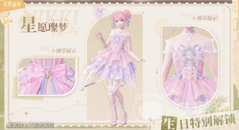 星愿璨梦属于甜美风格,稀有度四星,是代表生日的套装,穿上它代表指针迈过零点的时刻,和满天的星光一同见证着这个特别的日子。