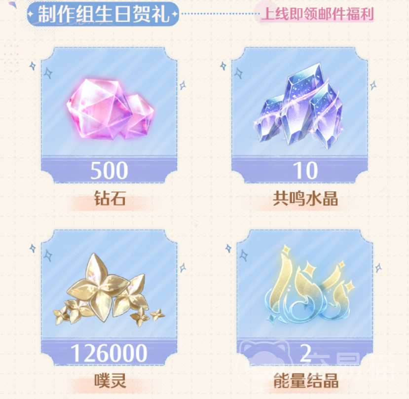 首先是神秘礼物,有1206钻和未知礼物。然后是生日贺礼,有五百钻、10个共鸣水晶、12万6千的噗灵,外加2个能量结晶。还有祝福心语,4星套装加上1206的纯真丝绒。
