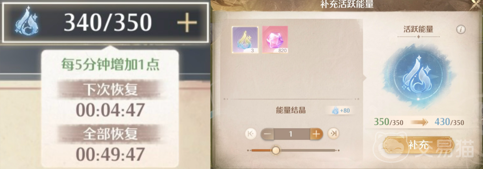 第二个途径钻石购买,钻石是游戏里相对比较珍惜的一种货币,活跃能量实在不足时,可酌情考虑利用钻石兑换,每次兑换能获得80点的活跃能量,第一次购买时会消耗50钻石。