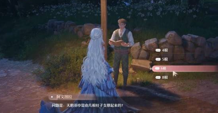 阿文图拉的外形是一名穿着西装,看上去温文儒雅的男性,玩家们走到他身边之后即可开启与他的对话,他会问你天鹅羽庭由几根柱子支撑起来,并且给你4个选项分别为4根,5根,6根和8根,正确的答案是6根,在大家做出正确的回答之后,天鹅羽庭这个任务就算是结束了。
