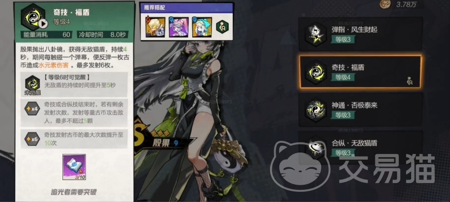 接下来是她的第二个技能叫做福盾,通过抛出八卦镜,殷果可以获得一个持续四秒钟的无敌护盾,在这期间内,每当接触到一次弹幕,就会反弹一枚古币,最多可发射六次,这项技能极大地增强了她在战斗中的生存几率,并且还能有效地反击对手,第三个技能名为神通技·负极泰来,此技能允许殷果利用八卦镜吸收周围散落的钱币,形成一个存钱罐子。