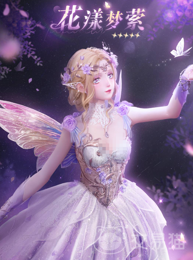 首先我们来看一下它的外观,整体采用了紫色调的配色风格。然后他背后的羽翼就犹如蝴蝶一般酷炫华丽,该服装的背景来自于花灵童话。这时我们就会感到疑惑,为什么寂寂无名的作家会设计出如此华丽动人的服饰,原来是因为来自于心中的童话。