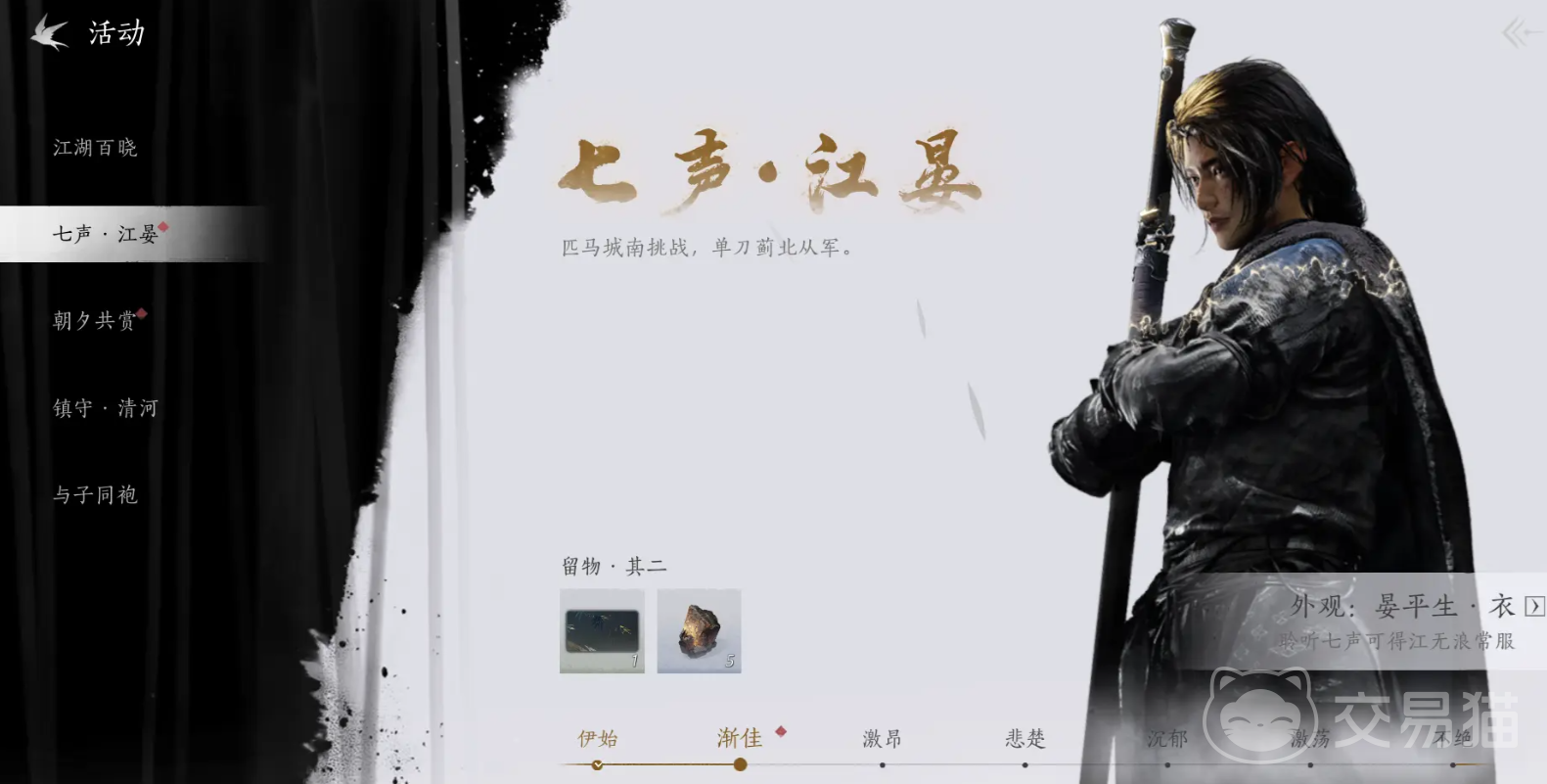 我们如果点击右上角的第四个图标,样式为一个小燕子,就会进入到活动界面,这里呢个看到一个叫做“七声·江晏”,这个大家可以理解为新手七日签到礼包,只要连续领取满七天就能拿到讲述江叔的衣服外观。