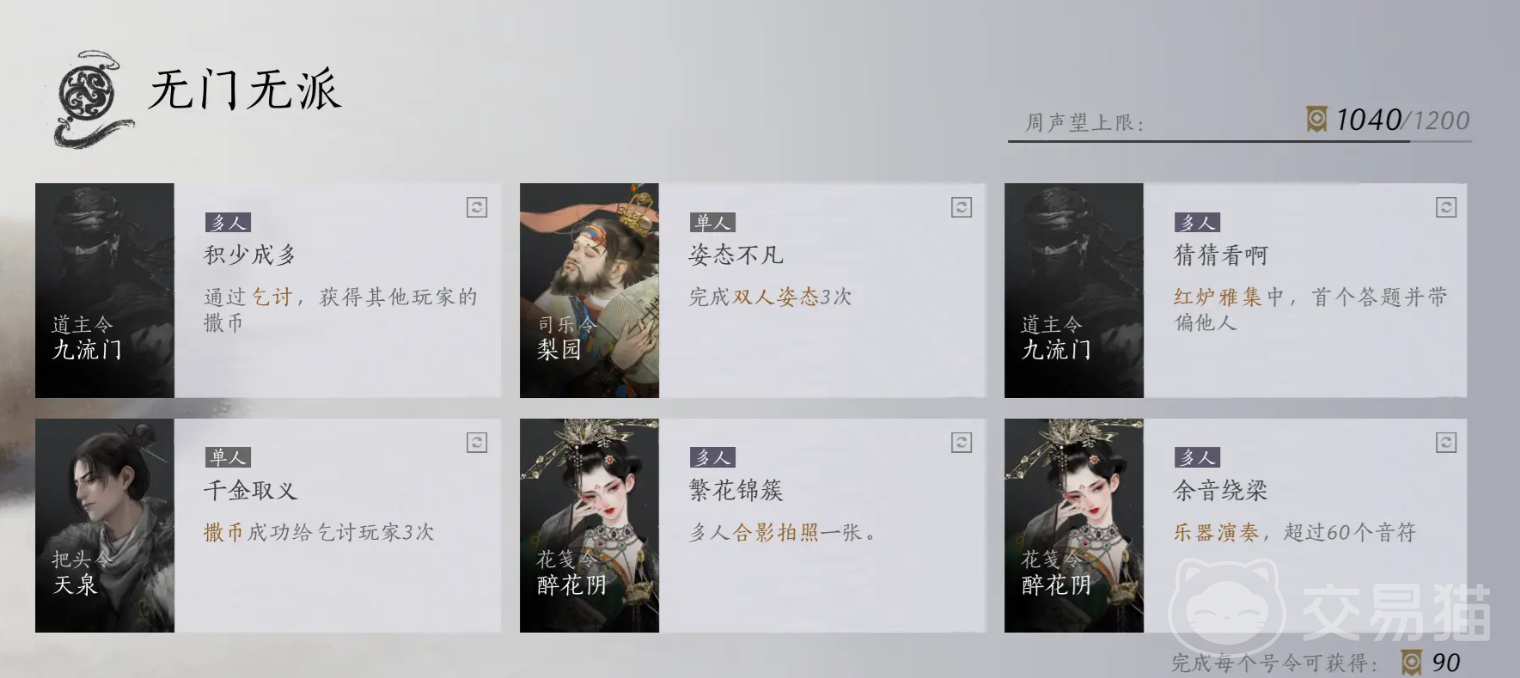 战令中的每日任务是固定的,有四个都不难完成,后续熟练了更是能快速清完,点最后一个图标选择门派后再点击江湖号令,这里能看到各个门派发布的日常任务,有的简单有的难,完成不了的可以刷新刷成适合自己的。