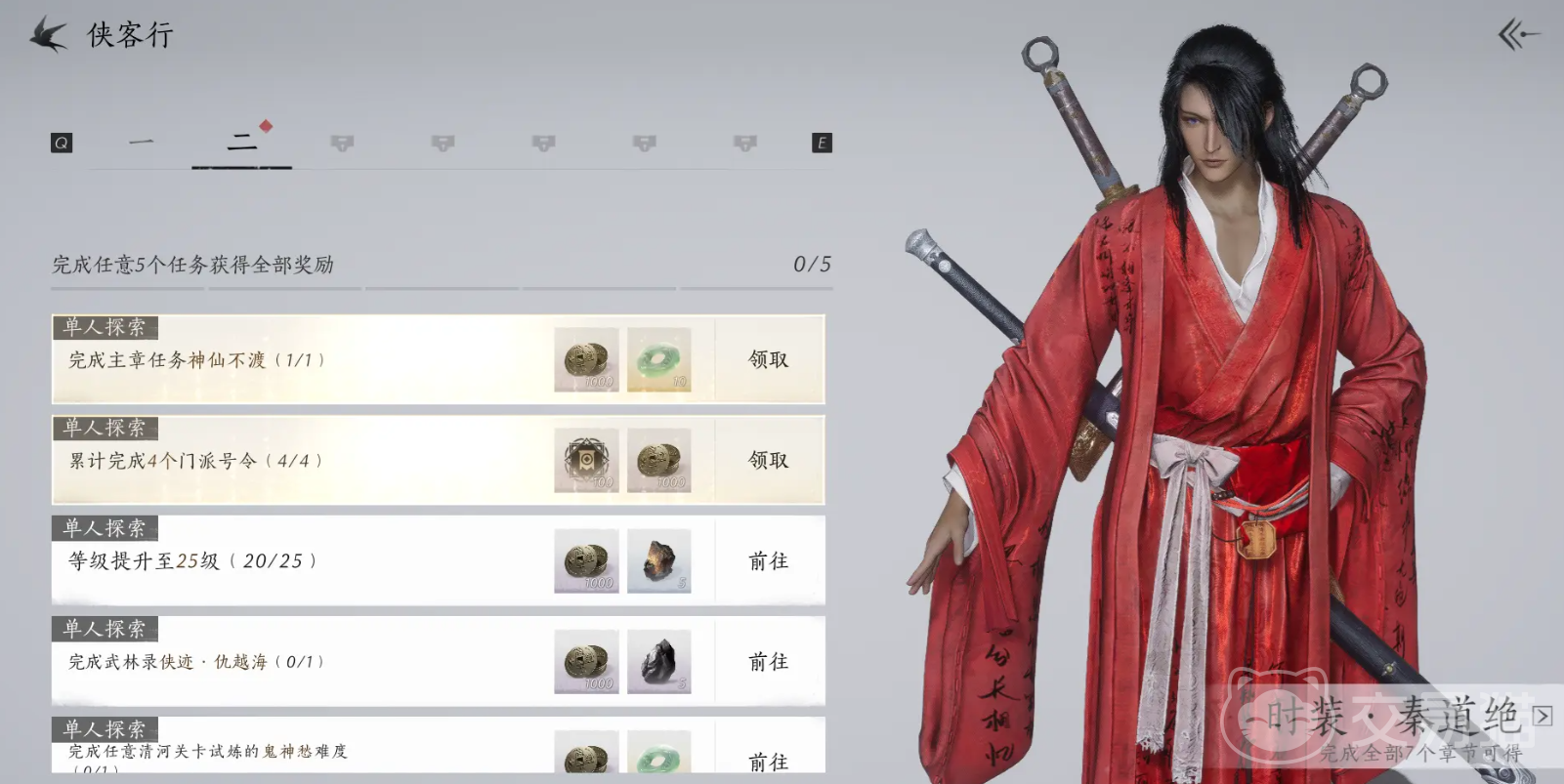在界面的右上角点击第五个小图标,样式为一个翻开的书本,点击后就能进入到侠客行,随后大家能看到各式各样的小任务,每个都会好完成,大家只需要选取五个去做就能领取所有奖励,其实就有点类似于新手七日成就。