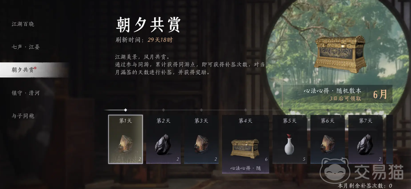 还是在右上角点击图标四,进入到活动中,能在刚刚的“七声·江晏”下面看到“朝夕共赏”,要做的事也很见到,同样就是每天签到领取礼包,点击第一个图标能进入到“战令”界面,点里面的任务就能看到每日任务。