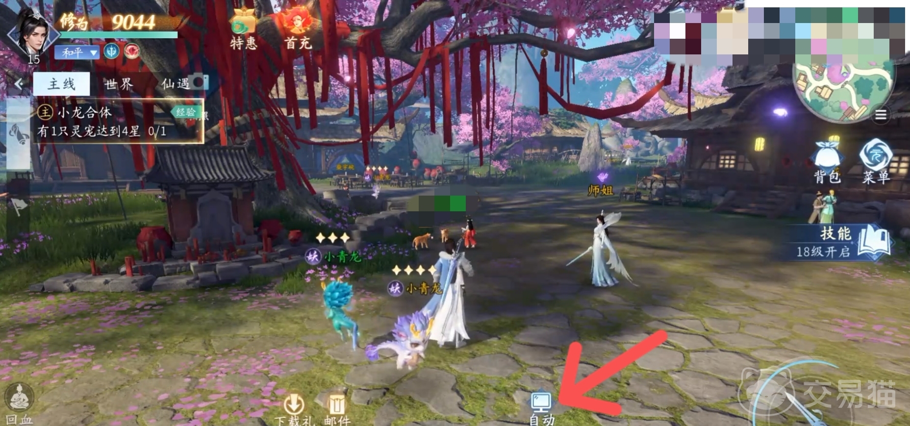 该手游是支持自动挂机的,在完成升星四级小青龙任务之后,就会在屏幕下面出现一个挂机的电脑按钮,然后继续跟随着指引点偷听几个黑衣人的密谋,变身小鸡靠近打探;在这里就可以第一次使用的自动挂机打怪功能了,在击败完三个黑衣人之后挂机是不会帮助大家主动完成任务然后去做下一个的,只会自动打怪。