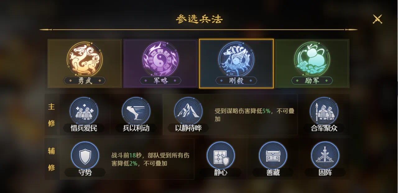 刚毅兵法主修的有惜兵爱民、兵以利动以及以静待哗,另外就是合军聚众能够使军队受到的谋略伤害降低,比较克制诸葛和司马这种武将;而辅修的有守势,战斗开局一段时间内部队受到的伤害会降低,还有静心,擅藏固阵等等,主要偏向于防守;最后励军相当于一个辅助兵法技能,用于提高阵容的各项属性,像士气值、谋略值等等。