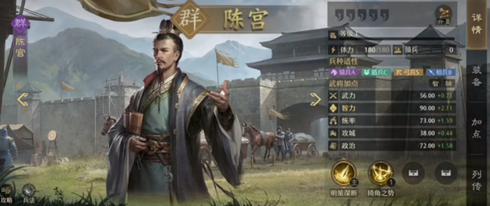 陈宫的主将技是对前方扇形范围内最多3名敌方部队进行攻击,他的自带技是对敌方进行攻击后补充我们自己12点的怒气,同时还会让自身部队下一次的主将技输出量继续提升15%。