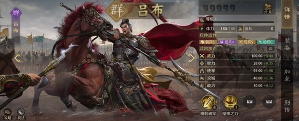 他的自带技是每次进入战斗的时候,自带2层无双状态,对目标造成武力伤害后,有30%概率为自己附加一层6秒的无双状态,最多能叠加到4层,他的主将技是对周围的三名敌方部队进行攻击,总伤害会由受击队伍平分,每成为命中1位敌方部队本次伤害的总倍率就会提升250%,并且还会使得我方部队的全体武将们暴击率提升20%,进入战斗的时候自动获得150点怒气。