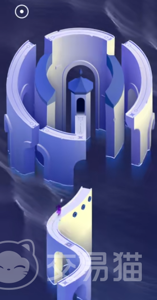 来到第二阶段,可以看到一座高塔,此时玩家们位于高塔最上方,将下方塔楼往右旋转至最左侧通道与楼顶连接,继续向右旋转180度,然后往左旋转20度左右,往前行进后继续向左旋转80度,即可下行到塔楼的第二部分。下两次台阶,将下方直角楼梯向左旋转至连接,然后向右旋转,水中会升起阶梯将当前地形与右侧矮楼梯平行,走到尽头后将屏幕向右旋转,使右下角地形升起,接着往左旋转,这时大家就可以走到水面上的紫色地砖部分。向左旋转后,通路完成,顺利通过第二部分。