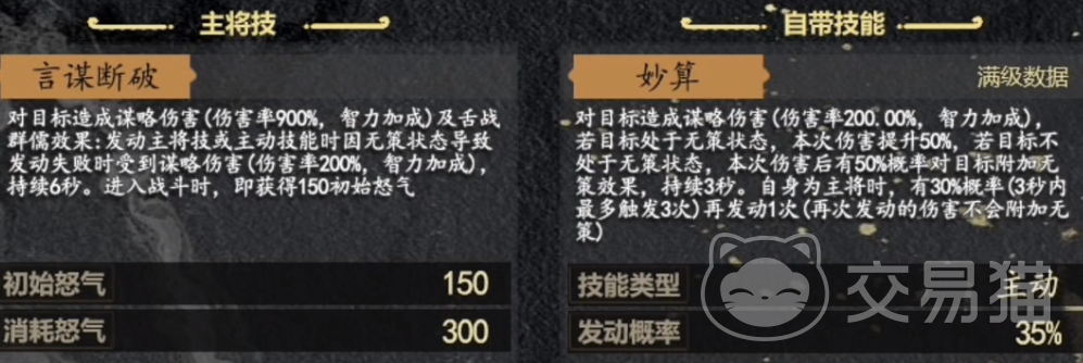 他的主要技能是言谋,对指定的目标造成伤害,此伤害类型为谋略,倍率则是高达900%,同时还可以享受到额外的智力加成,此技还能享受舌战群儒的加成。但此技能有一定的概率会发动失败,失败的话我方则是会遭受到200%的反伤害。这个技能失败的情况则是我方处于无策的状态,如果没有则一定可以释放成功,这点需要咱们进行注意和确认。