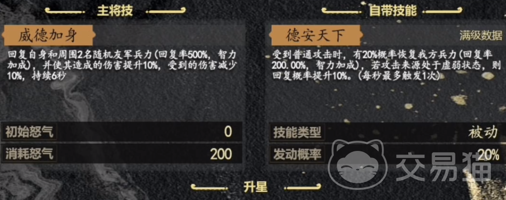 二技能则是德安天下,这个能力是我们在遭受到普通攻击的时候,有着2成的几率可以直接回复我方的兵力,回复率则是200%,这个能力也可以享受智力的加成,如果对我们使用攻击的敌人是处于虚弱状态,那么我们的回复概率将会提升1成,这个能力每一秒只可以触发一次。总的来说皇叔的能力都是辅助能力,能够回复的能力还是十分高的。这在升星后会更加明显。