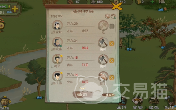 第二种途径是砍伐树木。大家在地图中寻找桃树、柳树的位置,点击树木,在弹出对话框中选择加号,挑中一位空闲的村民,进行砍树,就能获得木头材料。接下来,大家动手打造木板吧。