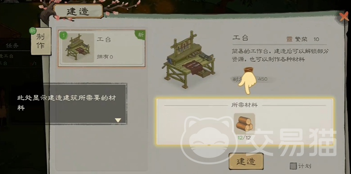 第二步制作木板。玩家打开建筑功能,选择工台页面。此时,工台的耐久度、繁荣、繁荣度都有显示。大家操作工台,选择木锤或者徒手,再设定好木头材料,进行木板合成。