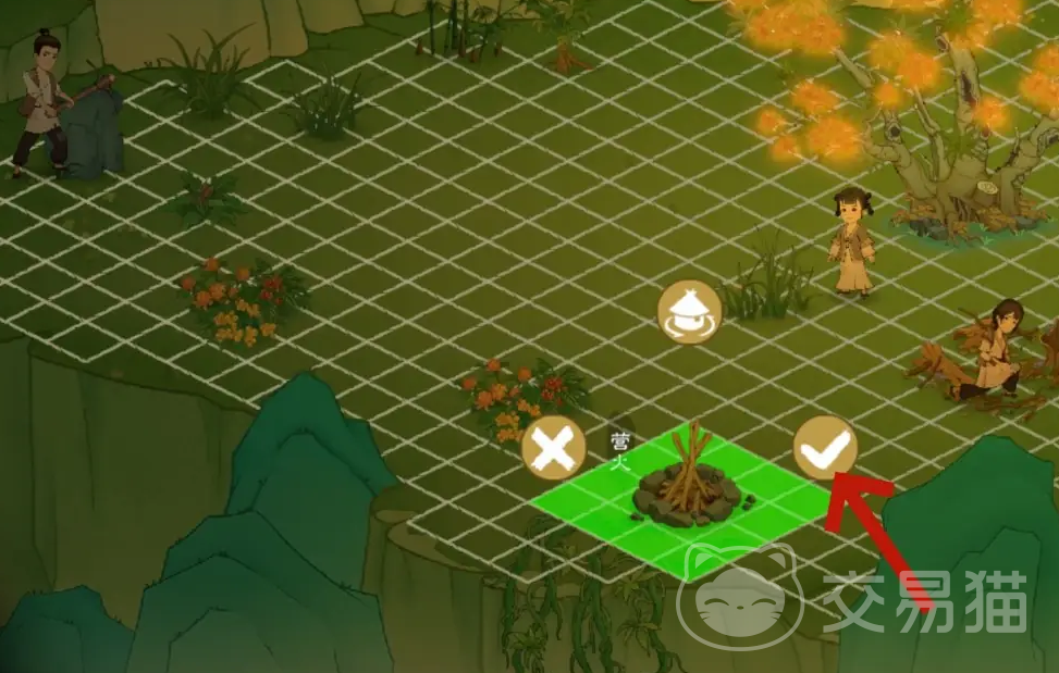 接着地图上就会出现网格,我们再将营火拖拽至空地上。然后也能自由旋转方向,最终确定无误的话就可以点击钩。就能直接生成一处火势非常旺盛的营火了,然后就能在上面制作各种简单的美食。
