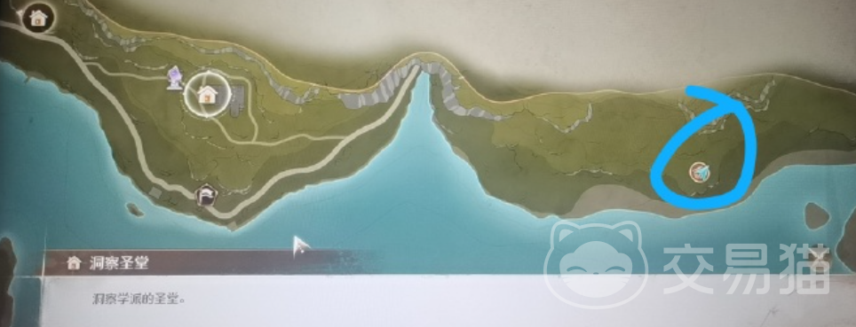 达到这里之后玩家还需要进行行走,顺着房子的方向一直往前走期间不要走小路也不要偏离方向。如上图随时,画圈的地方就是浮絮巨鸥位置,这个地方的名字叫做洞察圣堂。不过浮絮巨鸥位置并不是很精确,只是在画圈的范围里面寻找。