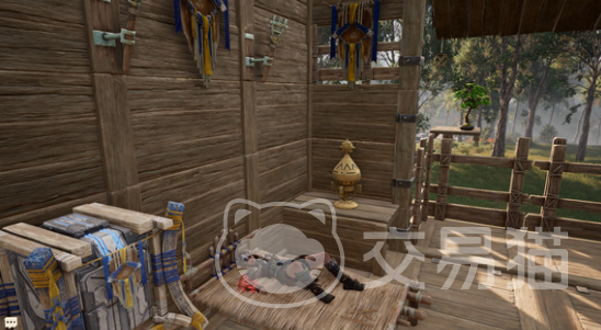 在窗户外面可以看到有护栏以及小型盆景,床正对面的视觉角度,还有一个巨大的圆形浴缸,右边就有储物架。可以体现出洗浴的效果,再来到1楼户外还能看到有顶棚、置物架,还有酒桶等等。