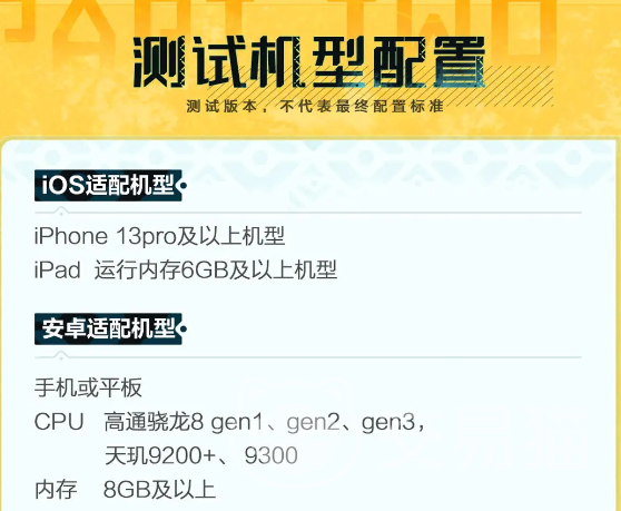 如果是iOS:建议选择iPhone 13pro及以上机型,运行的内存起码需要保证在6GB,如果是安卓版本CPU 高通骁龙8 gen1、gen2、gen3,内存应该保证是在内存8GB,在满足这些需求之后,才能在游戏中体验游戏。
