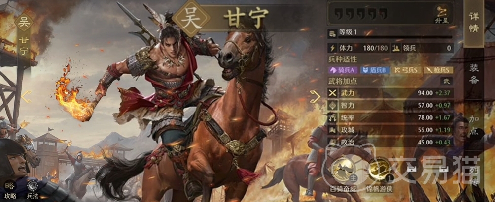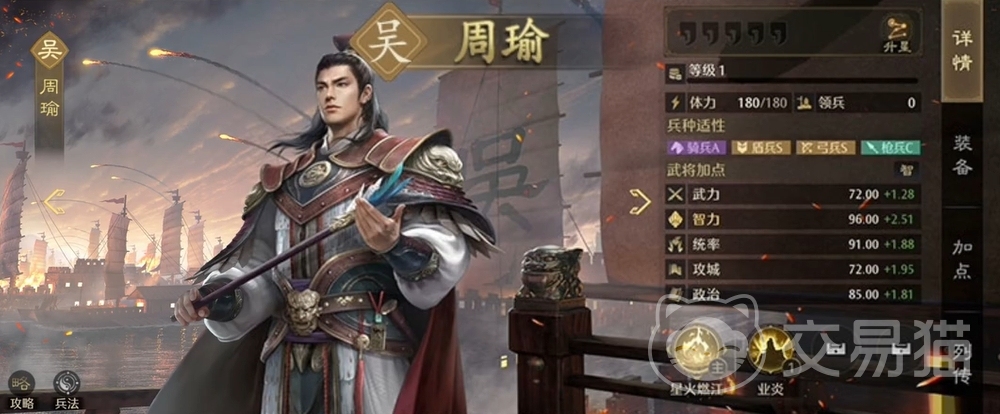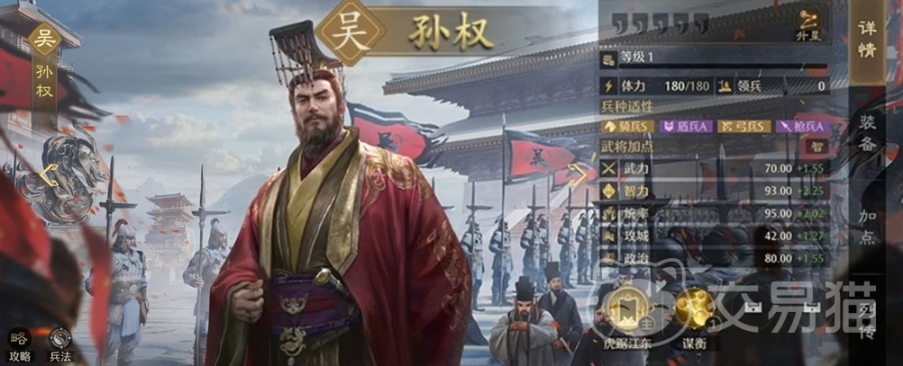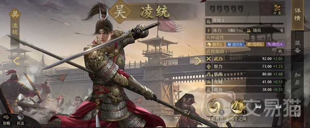 很适合用来进行快攻的武将,而且也是吴国势力中最合适放在副将位置上的人选之一,无论是能造成溃散效果的能力,还是在战斗初期为全体提升武力的能力,都令他很实用。