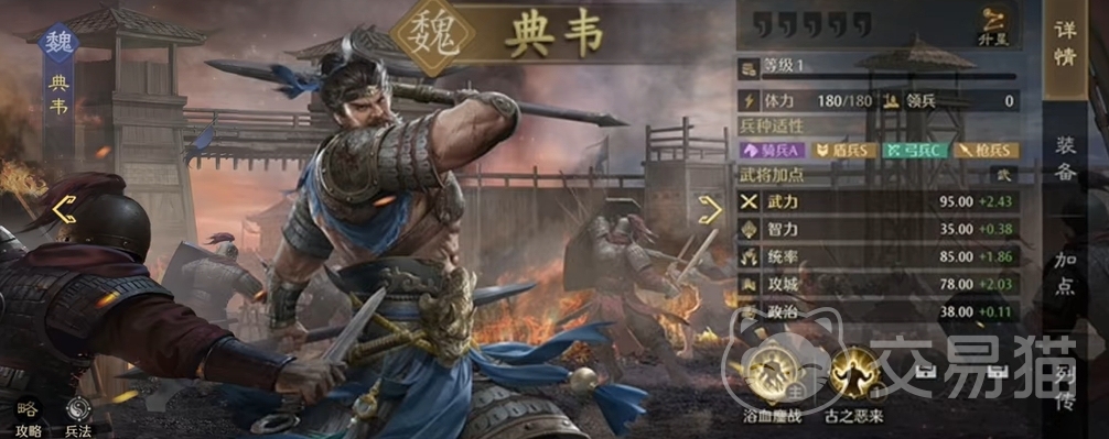 其自带技能古之恶来可让他在被进行普攻时发动反击,而且能获得主将15%的武力,若主将是曹操则为30%,这一特性也令典韦更适合担任副将的位置。