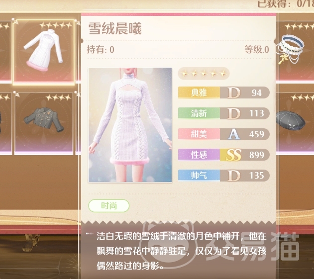 里面的五星装扮包含了性感度比较高,甜美度比较高以及典雅度比较高的时装配饰,而且其中的毛衣裙雪绒晨曦也是一个颜值不错的装扮,还是值得大家入坑去抽的。