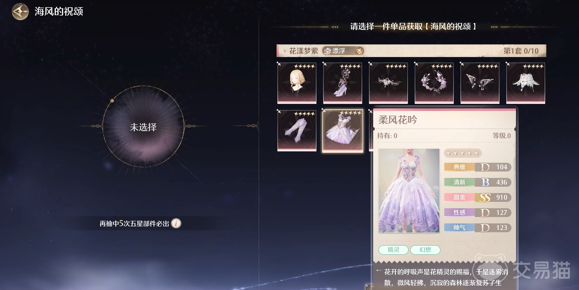 如果人们有特别想要的五星单品,可利用海风的祝颂功能指定该单品为下次必出的五星单品,该方法也可用来规避重复共鸣出同一件单品的情况。在人们将套装单品全部都拿到手后,会有相应的套装展示动画来告知玩家。