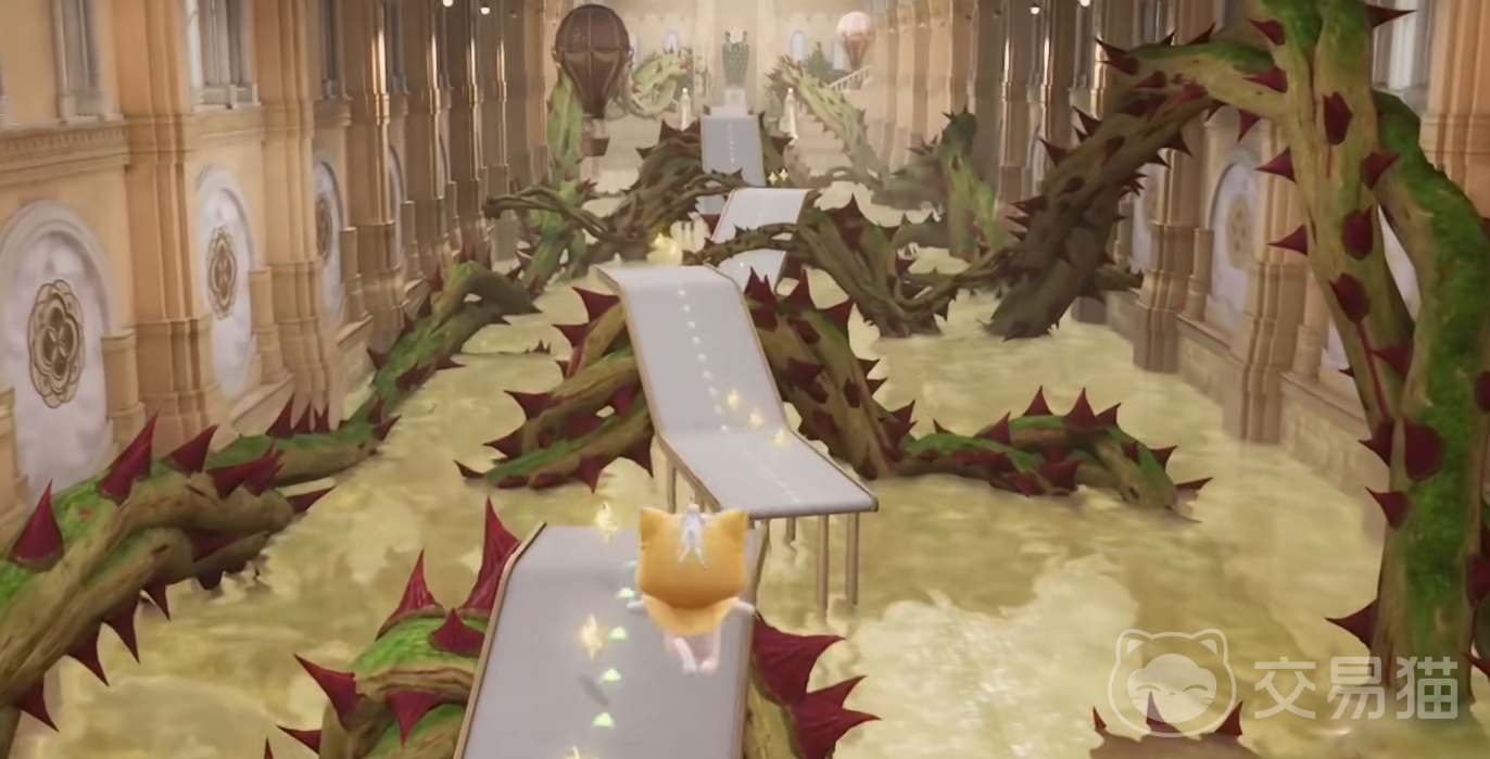 过这段路的最好办法就是利用好二段跳,尽可能地令大喵在第一次跳跃时到达最高处后再进行一次跳跃,从而在高度上能越过大部分的荆棘,少部分越不过的可用几何跳的方法,即往旁边跳出传送带范围,越过荆棘后再用二段跳改变角度回到传送带上。等通过这一段荆棘路后,只要按下终点位置的开关便能完成工坊的重启。