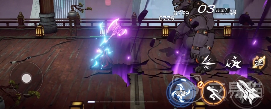 二技能则是,第一段向四周掷出回旋手里剑,第二段闪至敌人另一侧去进行打击,若是此时手里剑没能成功收回,那么就会去收回手里剑。
