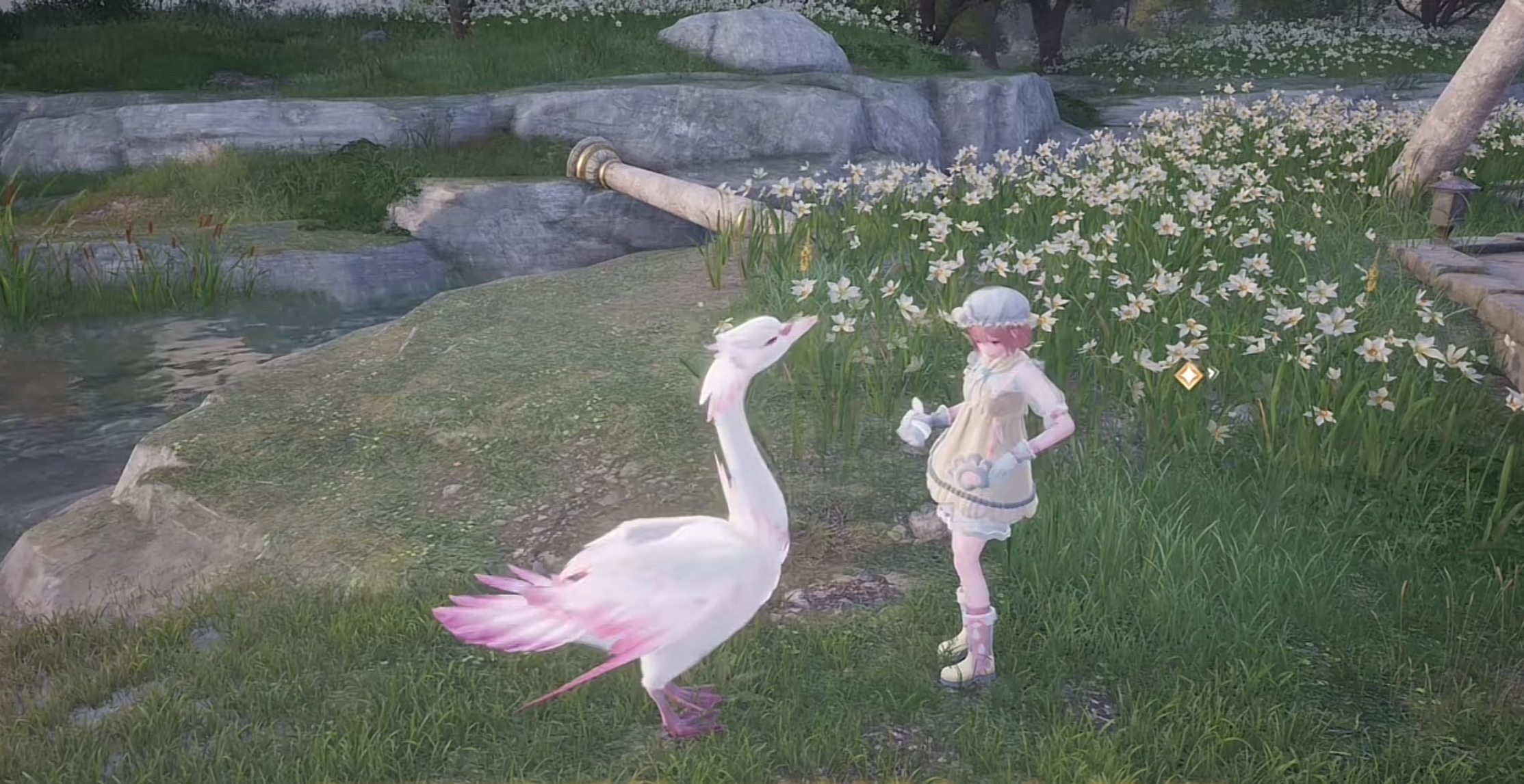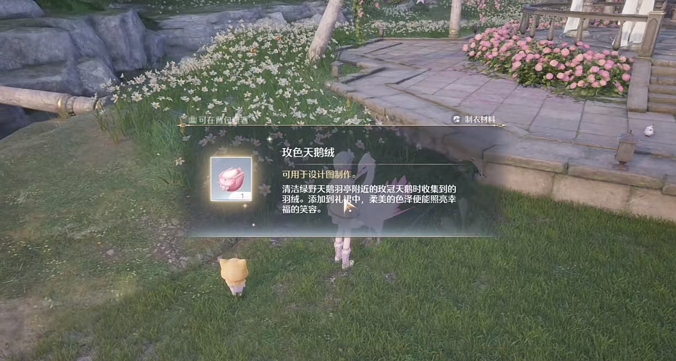 由于这个材料比较珍贵,而且一天24小时只能薅一次,所以只要传送到这个位置,就把两只天鹅全部薅一次。大家可能在石树田村也能看到一只天鹅,从它身上直接清洁出来可以获得的是天星之羽;还有盛宴毛毡以及曙光毛团等等都是有清洁时间限制的,尽量全部拿满后续制作图纸的时候才不会卡材料。