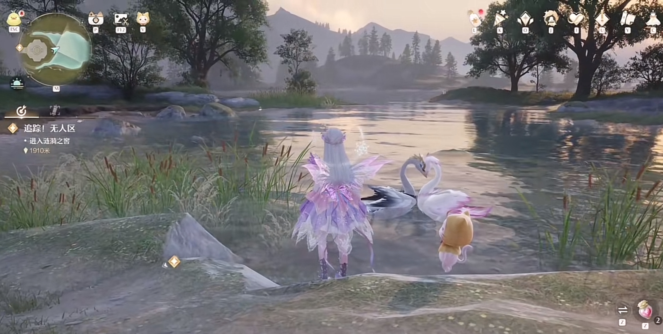 千万注意它们在湖面上游着的时候是不可以做清洁的,即使换上清洁套装靠近它们也没有任何的清洁图标。只能等它们两个游玩一段时间之后,靠近岸边,然后一起碰撞秀完恩爱,然后两个都会上岸了,再次靠近之后就可以获取它身上的天鹅绒了。