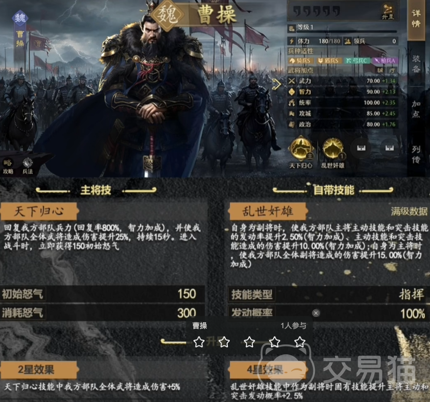 天下归心的释放是需要300怒气的,也就是说曹操只要释放该技能就能立即恢复一半的怒气值,这在面临群战的时候将会是恐怖的恢复能力,除开升级以外九牧之野还能够升星,如果玩家能够将曹操升到两颗星星,那么天下归心的技能将会对我方所有部队的武将造成伤害再次增加百分之五。