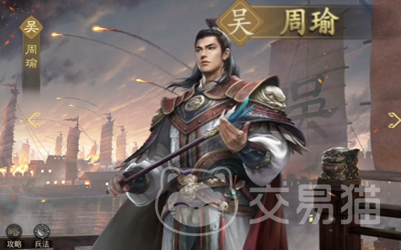 周瑜,大都督,带盾、弓兵,智力和统帅突出,主将技范围最多3单位谋略伤害附加3秒持续掉血的燃烧效果,入战获得100怒气。自带技的效果是己方所有武将在发动主动技能的时候自身有50%对目标造成谋略伤害,如果目标是在燃烧中则伤害提升,若是自己作当主将则必定造成伤害。如果目标不处于燃烧状态且自己是主将,那么这次伤害会附加燃烧状态。